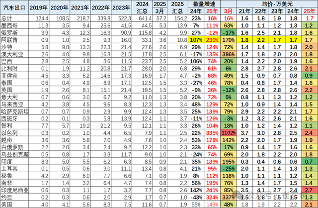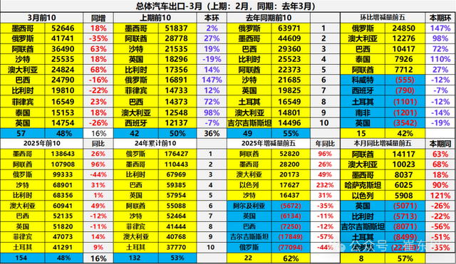 2025年1-3月汽车出口结构变化,墨西哥上升到领军出口地位。对俄罗斯出口下滑到3月的第2位,阿联酋和沙特的出口提升。澳大利亚的出口恢复,巴西出口同比下滑。