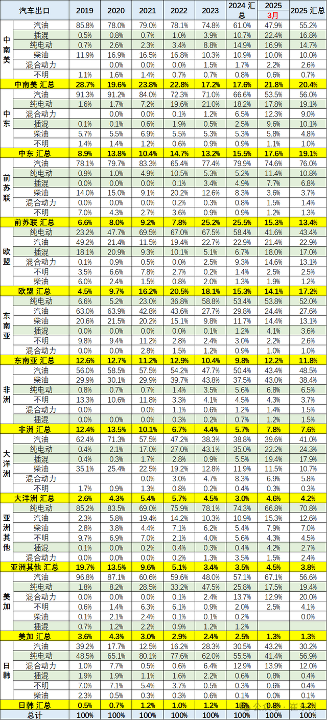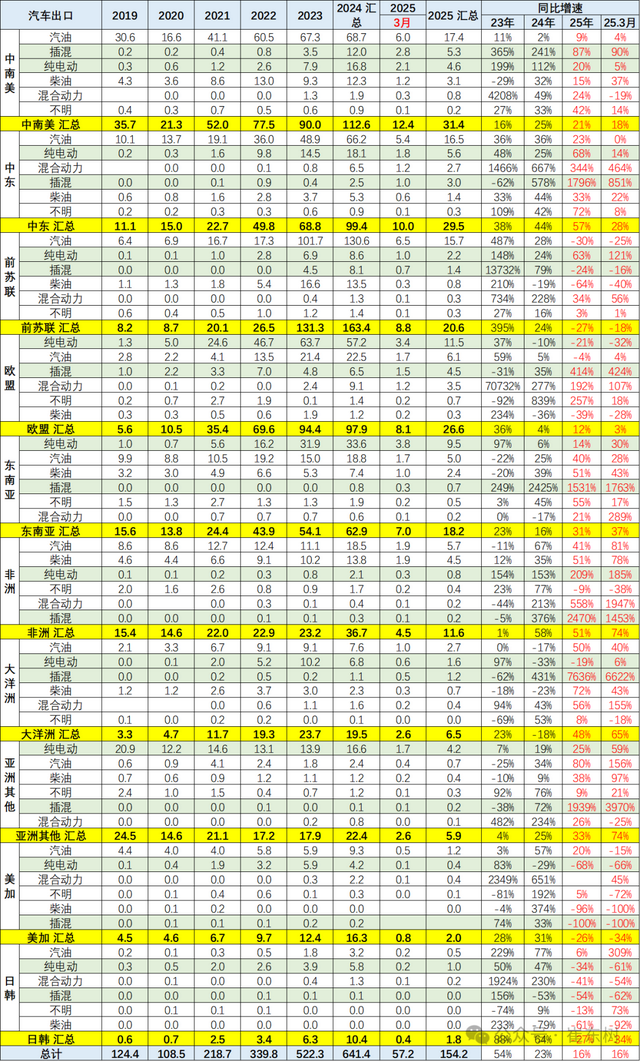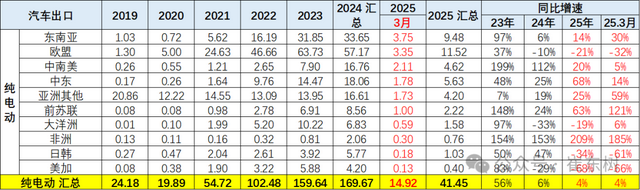 2025年1-3月对前苏联地区的出口下滑巨大,对欧洲、美加地区的纯电动出口也下滑较大。但对大洋洲和中东等地区仍相对较好。2025年增长是挖掘中东、非洲、东南亚等市场的结果。
