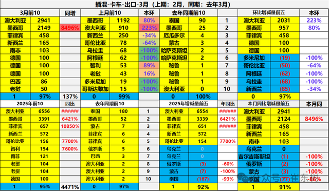 插混的卡车出口市场近期暴增,目前的澳大利亚、墨西哥等前几位总体表现较强,头部出口市场等的新能源卡车出口暴增。