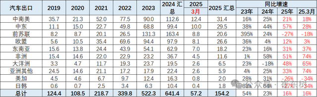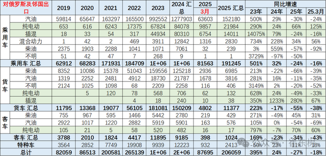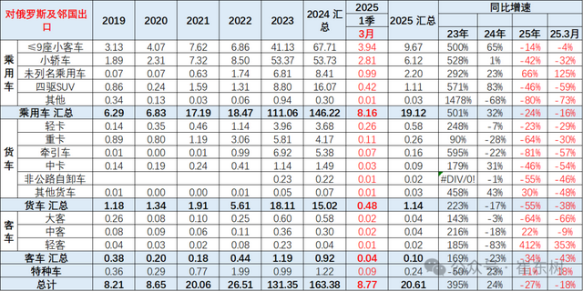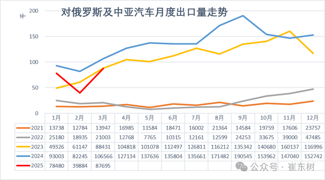 2022年中国对俄罗斯和中亚的出口26万辆,2023年中国对俄罗斯和中亚汽车出口131万辆,同比增长395%。2024年全年中国对俄罗斯和中亚出口164万辆,同比增长24%。2025年1-3月中国对俄罗斯和中亚出口21万辆,同比下降27%。