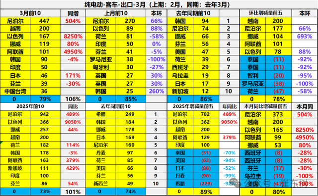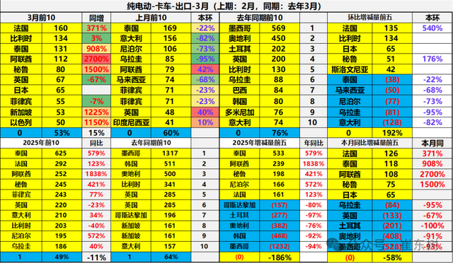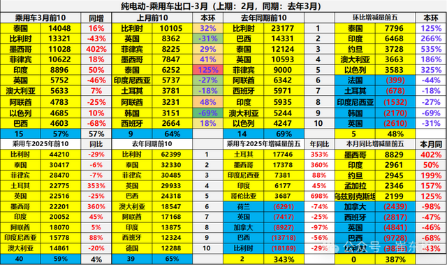 中国纯电动乘用车2025年1-3月出口主要增长的土耳其、墨西哥、印尼等;下滑市场是比利时、巴西、加拿大、英国等。