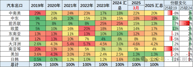 中国汽车出口总体表现较强,其中针对中东和非洲以及大洋洲的出口表现相对优秀。而针对前苏联地区、美加、日韩出口表现压力较大。