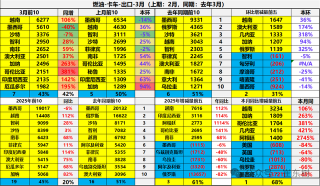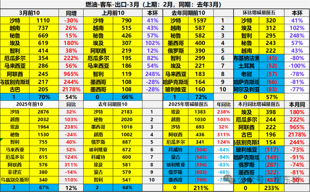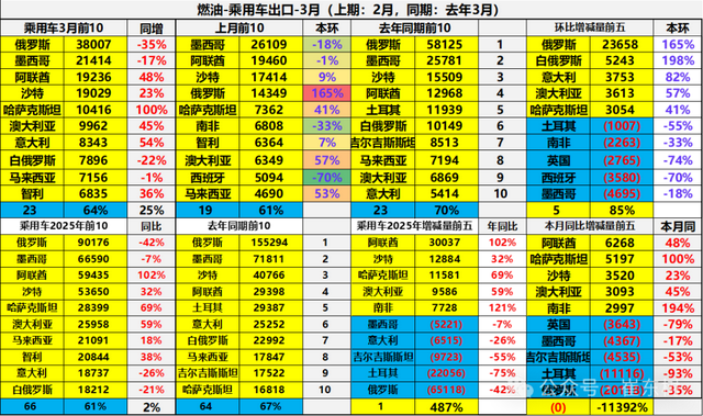 中国燃油乘用车2025年1-3月出口规模最大的是俄罗斯、墨西哥、阿联酋、沙特、澳大利亚、意大利等。今年燃油乘用车增量的主要是中东和澳大利亚等。