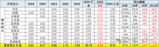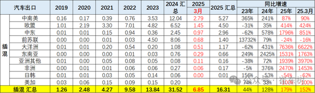 2025年1-3月中国新能源插混车型出口16万,增179%,其中3月插混出口6.9万增152%。除了前苏联、日韩、美加等地区的插混需求下滑较快,其它地区的中国插混表现都很突出。而欧盟地区的中国插混车型需求增长,中南美的插混出口成为新增长亮点。