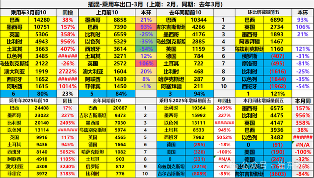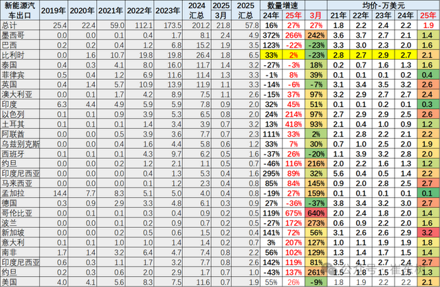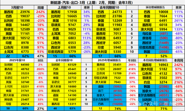 2025年3月中国新能源汽车出口总量的前10国家:墨西哥23976辆、巴西19037辆、比利时18398辆、泰国14467辆、菲律宾12589辆、英国11161辆、澳大利亚10512辆、印度8978辆、以色列8388辆、土耳其6773辆;2025年3月中国新能源汽车出口同比2024年3月增量的前五国家:墨西哥16963辆、澳大利亚5182辆、以色列4132辆、菲律宾3502辆、约旦3274辆。