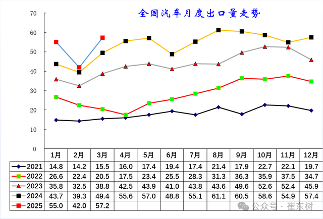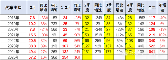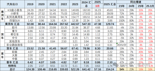 2025年1-3月中国汽车实现出口154万辆,同比2024年1-3月增速16%,3月中国汽车实现出口57万辆,同比增16%,同、环比走势总体较强;今年的主要动力仍是中国产品竞争力提升和全球南方国家市场的小幅增长