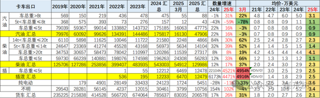 卡车出口市场前几位总体表现稳定。2025年1-3月主力出口市场的越南、墨西哥、沙特、智利等出口较强。目前增量的是越南和印尼等。