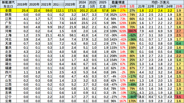 2025年新能源汽车出口比较强的地区是陕西、江苏、上海、广东、浙江等。