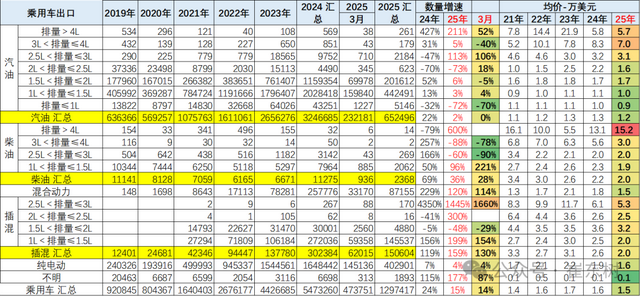 1、乘用车分排量出口