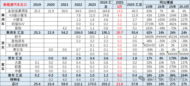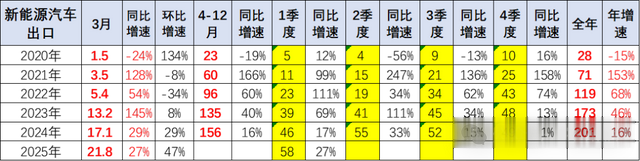 从2024年6月后,新能源出口走势低迷,市场压力较大。11月出现异常负增长局面。今年1月新能源车出口暴增的走势超强,3月新能源出口创历史新高,奠定了2025年的开门红基础。