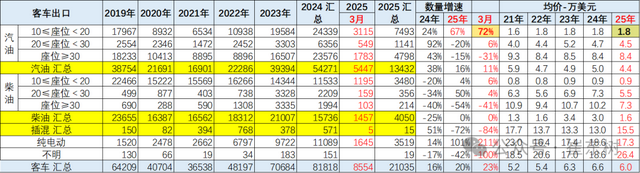 2025年1-3月纯电动客车出口增长20%的表现较好,汽油客车出口增长较大,但柴油客车出口萎缩。
