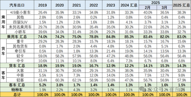 乘用车内部的几类主力车型表现较均衡,表现下降的是未列名乘用车的出口。2025年9座以下客车占比38%,其中3月达到37%;特斯拉的出口回落的影响较大。