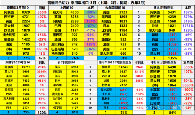 2025年3月出口普通混合动力的主要是阿联酋8329辆、西班牙4721辆、英国2224辆、意大利1907辆、以色列1870辆、澳大利亚1691辆、墨西哥1422辆、法国1185辆、沙特1080辆、美国973辆。2025年增量主要是阿联酋6498辆、西班牙3789辆、以色列1870辆、意大利1636辆、沙特1064辆。
